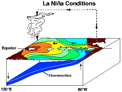 La Niña: La Niña is considered as the cold phase of ENSO. In the eastern tropical pacific, ocean temperatures appear to be lower than usual, caused by stronger easterly trade winds. Warm water is pushed to the western tropical pacific, therefore colder water rises in South and Central America. This circumstance has an impact on global weather. Australia, Indonesia and also the equatorial Pacific for example appear to be wetter than usual while South America faces droughts. Europe may face colder weather in the beginning of winter and a mild ending of winter. La Niña lasts for one to three years.