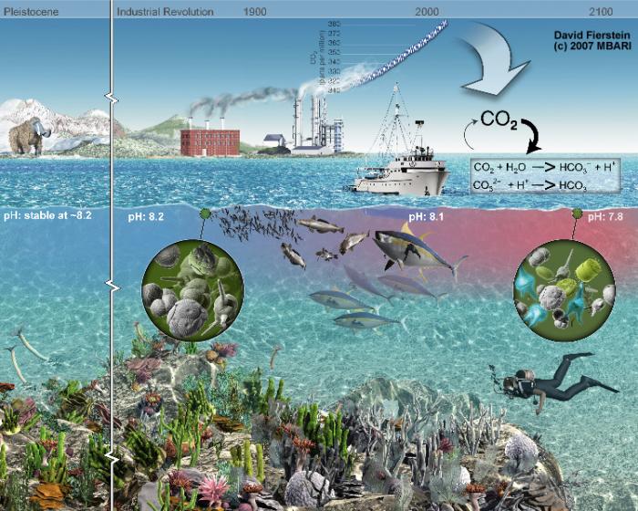 During the last 200 years water has become 30% more acidic, faster than any change recorded in the last 50 million years. The reason is that due to industrialisation there appear higher concentrations of CO2 in the atmosphere which dissolve in the ocean and makes it more acidic.